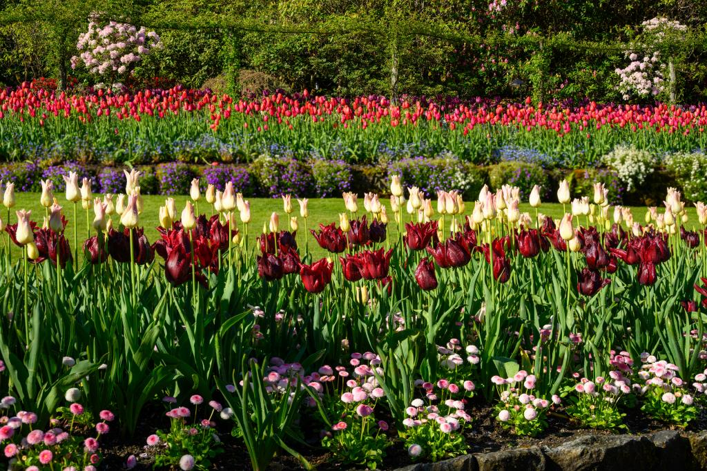 The Tulip show at The Butchart Gardens includes nearly 200 varieties amongst the 160,000 bulbs that were planted in the fall. Most of our Tulipa beds are traditionally planted with different varieties of Myosotis (Forget-me-not), which were a favourite of Jennie Butchart.
