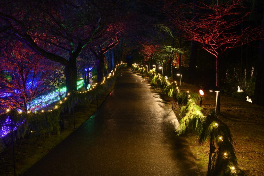 La promenade nocturne est riche en ambiances. Des allées bordées de cèdres conduisent les visiteurs à travers les douze jours de Noël, avec des lumières scintillantes, des décors fantaisistes et de la musique festive. Promenez-vous parmi les vieux arbres historiques et laissez-vous émerveiller par leur grandeur. C’est fascinant.