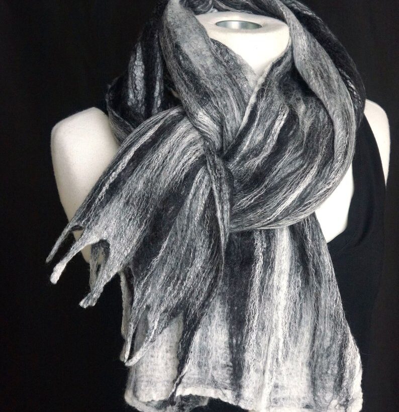Les écharpes de Jenny sont disponibles dans la galerie. Ces superbes pièces, dont les motifs ne se ressemblent pas, ajouteront un élément créatif à n’importe quelle tenue. Dans des couleurs assorties, les écharpes vont de 180,00 $ à 225,00 $.