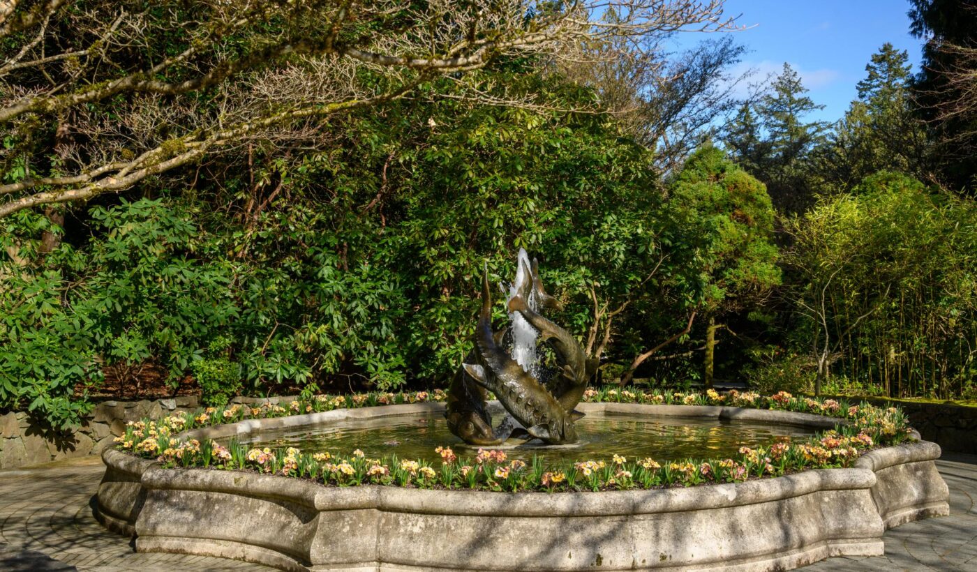 It is time to come out of a winter slumber and visit for a much-needed walk amongst the flowers. Mild temperatures and sunny days have filled The Gardens with a bounty of early spring blooms. Timeless classics such as Narcissus brighten the garden beds, and pretty Primula and Viola adorn the many containers. Many Rhododendron, Camellia, Daphne, and other early-flowering spring shrubs bloom throughout the grounds with exquisite blossoms and fill the air with sweet fragrance. Gorgeous pink petals of Prunus cerasifera ‘Pissardii’ blow softly through the air, creating a whimsical ambience. Spring. This is what it is all about.