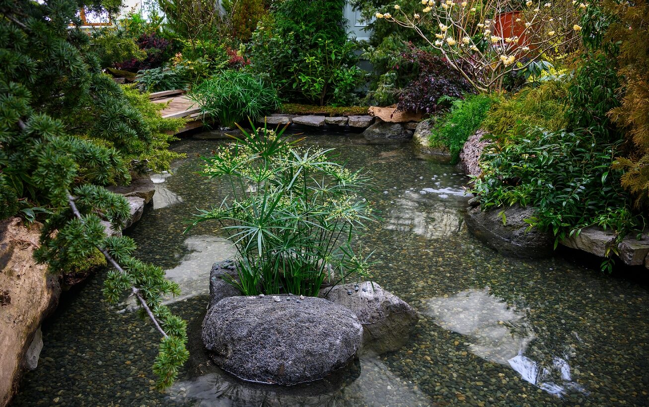 The Spring Prelude exhibits many historical artifacts as the design focuses on mixing progressive new concepts complemented with a touch of rich history. Noteworthy is the in house designed water wall feature which showcases old Portland Cement pots that were made at Mr. Butchart’s cement factory. The old ore-carts have been utilized as a garden design feature with carefully chosen plant material. Some of the other garden art features made in house have also derived from Portland Cement. These include the contemporary cement pillars, the ball planter and the hypertufa pots in the pond.