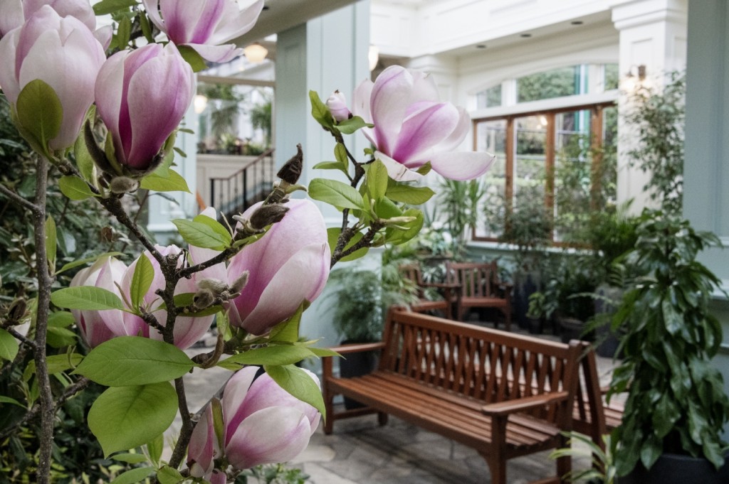 Winter is fading away for yet another year. With every new day, little signs of spring have begun to emerge, provoking that legendary phenomenon; Spring Fever. It is impossible not to feel it – the days are getting longer, first blossoms are occurring, some days are feeling more like spring than winter. In the Sunken Garden, the first early Tulip flower offered a glimpse of bright colour amongst all the promising buds, swollen, ready to bedazzle. Drifts of Anemone blanda (Windflower) flow throughout The Gardens with delicate blue-daisy like flowers. Some early Rhododendron, Pieris and Magnolia blooms have begun to crack open. Now, the graceful old garden is poised, ready for the springtime show.
